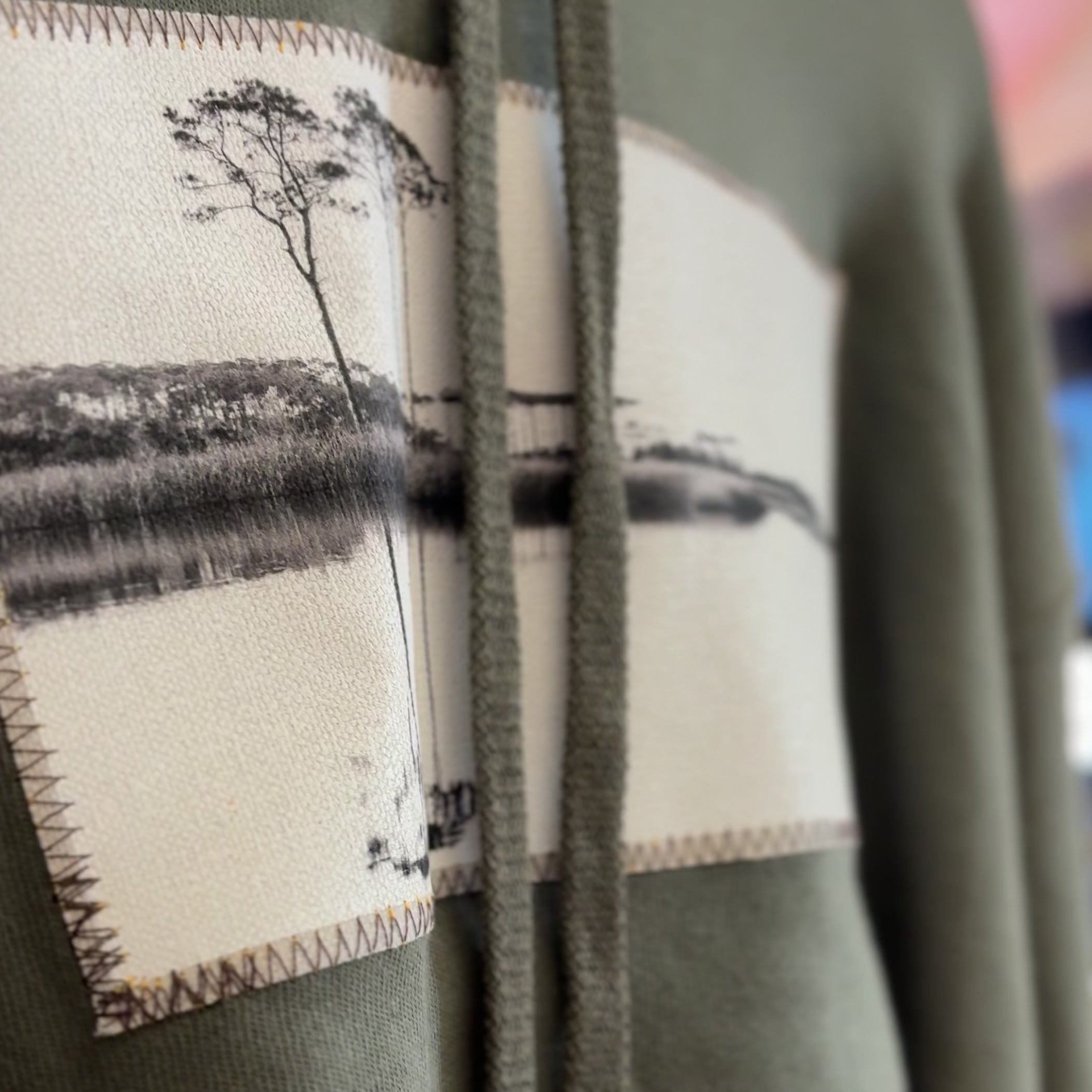Cropped hoodie with a western lake design on a blurry store background